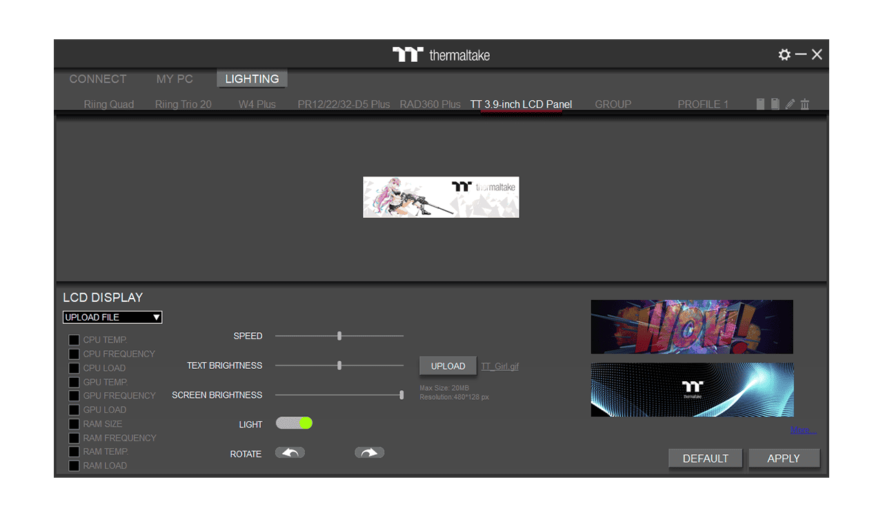 3.9'' LCD Screen Kit can be easily paired with other Thermaltake Ultra series components and create interaction among the LCD panels through the TT RGB Plus 2.0 software. Users can customize all the monitors in their chassis according to their own preferences.